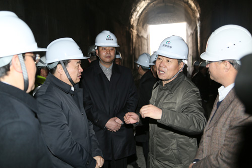 當(dāng)天中午12時(shí),郝鵬省長、馬順清、嚴(yán)金海副省長率領(lǐng)高華秘書長、張文華副秘書長,以及省總工會(huì)、省發(fā)改委、省政府辦公廳的有關(guān)負(fù)責(zé)同志,來到引大濟(jì)湟工程現(xiàn)場調(diào)研。調(diào)水總干渠是“引大濟(jì)湟”的控制性輸水工程。在大坂山北坡的總干渠進(jìn)口,省領(lǐng)導(dǎo)踩著沙礫,走進(jìn)隧洞,詳細(xì)了解工程每天的掘進(jìn)情況。了解到卡機(jī)脫困這個(gè)長期制約工程進(jìn)度的突出難題得到有效解決,項(xiàng)目建設(shè)正在扎實(shí)有序推進(jìn)時(shí),郝鵬十分高興,他指出,一定要加大現(xiàn)場協(xié)調(diào)力度,狠抓施工關(guān)鍵環(huán)節(jié),努力破解技術(shù)難題,盡快實(shí)現(xiàn)人工鉆爆和TBM機(jī)相結(jié)合的掘進(jìn),在確保工程質(zhì)量和安全的前提下,一米一米地倒排工期,加快工程進(jìn)度,早日將剩余約8千米貫通。隨后,郝鵬省長向青海水電集團(tuán)駐工地一線代表頒發(fā)了省委省政府春節(jié)慰問金。