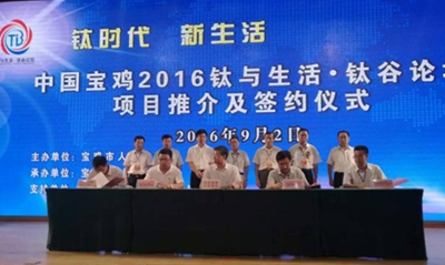 9月2日,青海水電集團副總經理、青海聚能鈦業股份有限公司董事長吳世周應邀出席在寶雞舉行的 “第二十五屆中國西部商品交易會” 和“中國寶雞2016鈦與生活·鈦谷論壇”項目推介活動,并代表青海聚能鈦業有限公司與寶雞市政府簽訂了戰略合作協議。